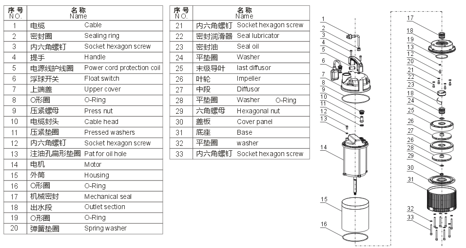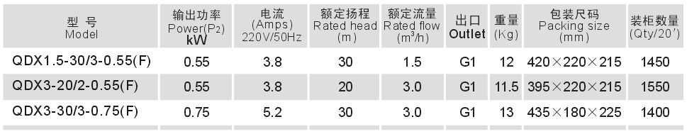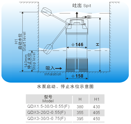 热保护器:带热保护器(单相机)绝缘等级:F级防护等级:IP68自动浮球开关工作原理: 当水源水位升到设定高度时,自动浮球接通,电动机通电工作,水泵开始抽水; 当水源处水位下降到设定高度(可能危害到水泵工作安全水位)时, 浮球开关断开,水泵停止工作。根据客户需求可以选择是否加装自动浮球开关,标准产品不装.工作条件:介质温度:0~40℃ 潜水深度应小于: 5m