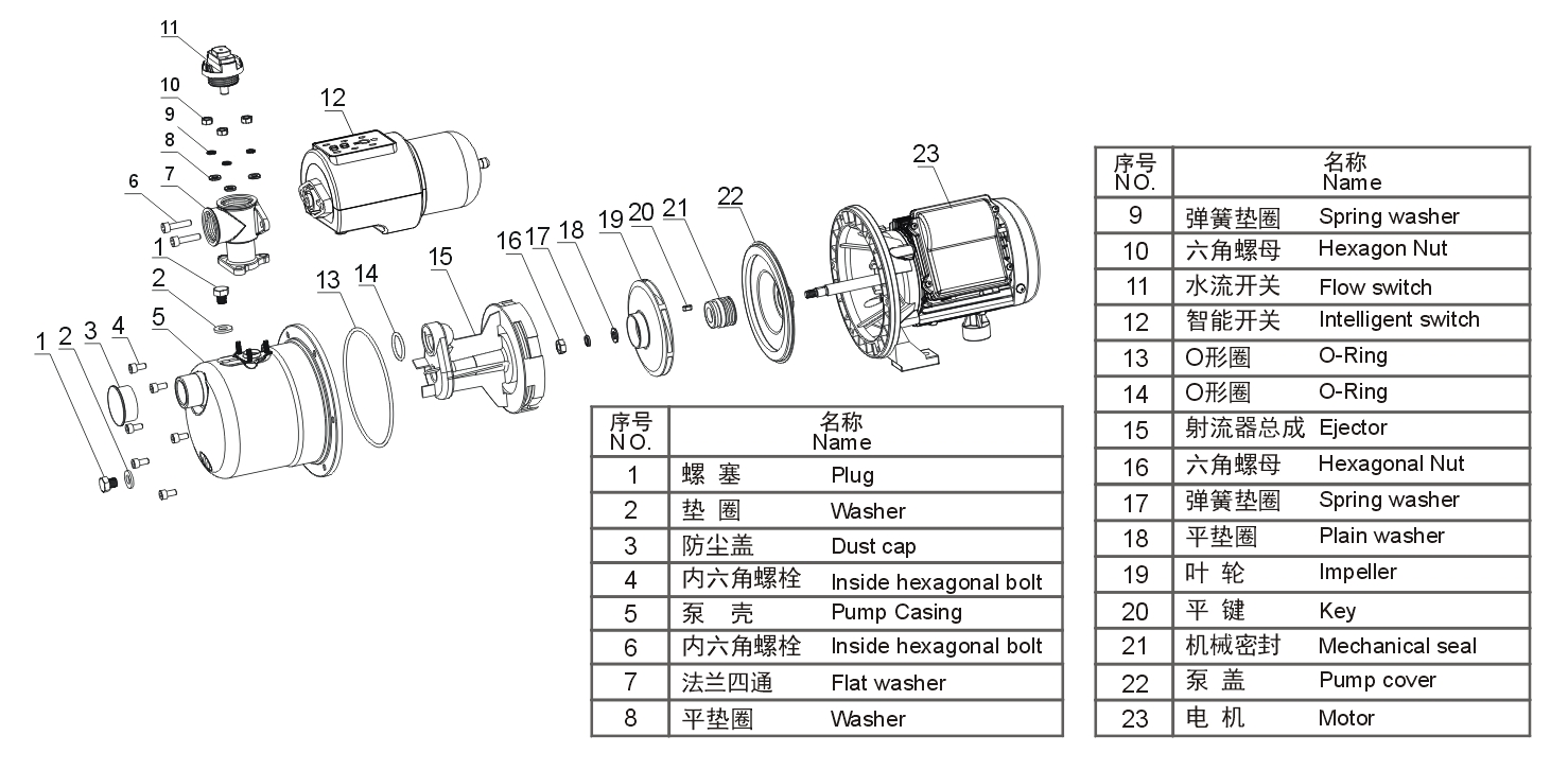 特点:●智能开关带数显功能,实时显示水泵运行压力;●可选智能模式或水塔模式;●噪音低、寿命长;功能:●无水保护和检测●闭阀停机●自动增压●断电复位●预防卡死●小流量启动●模式切换(智能模式/水塔模式)